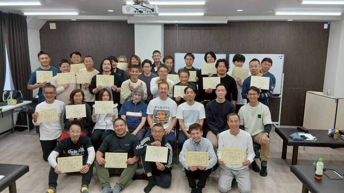 この写真に写っているのはワタシが所属した1班で、今日ほぼ同じ人数の2班の方も同様のフィナーレを迎えていて、50数名が新生真体療術の栄えある0期生です。懇親会が人口密度凄くて酸欠になりそうでしたよ(笑)