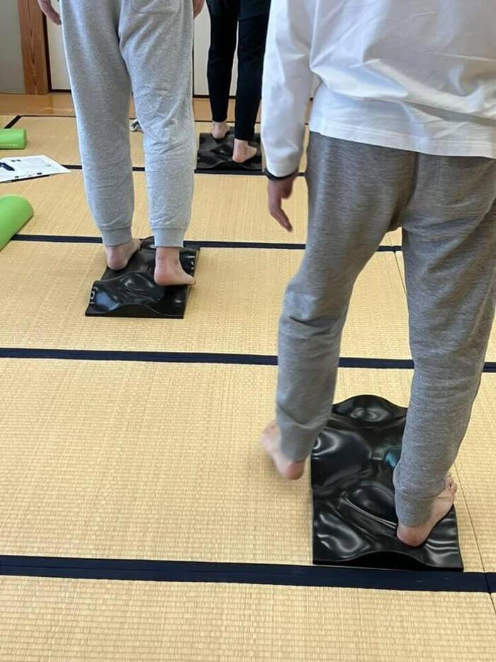 それだけでなく、エクササイズ前の立った時の足の裏の感覚、片足立ちのグラつき、前後屈の可動域など大いに改善しているのもまた実感できます。「早く施術に取り入れたい!!」自分で体感しているからこその思いも湧いて来ます。