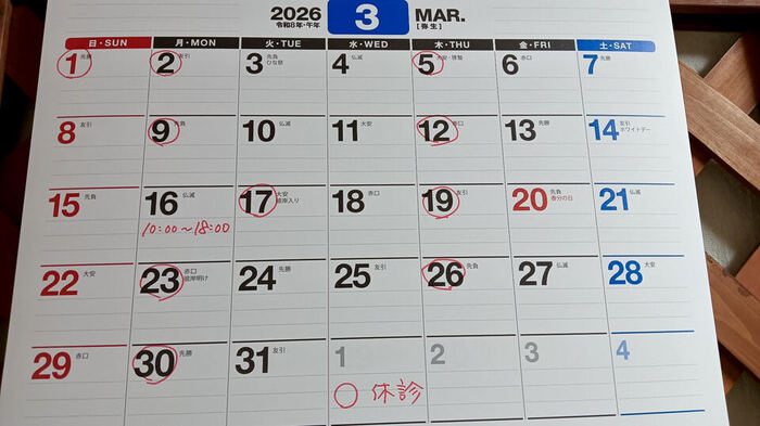 1/13(火)は真体療術の復習会のため休診し、前日の1/12(月)営業するなど中旬以降に変更があるので、1月のお知らせはまた改めてお伝えしますね。