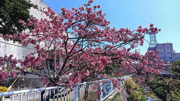 沖縄の桜は濃いので、青空に映えますね。